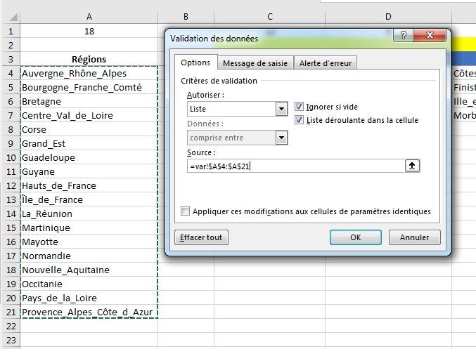 Avec cette méthode, lorsque vous cliquerez sur la cellule pour indiquer la région, dans la liste déroulante qui va apparaître, vous aurez toutes les lignes y compris celles qui sont vierges de 22 à 100 ! C'est pourquoi je ne trouve pas cela "propre" !